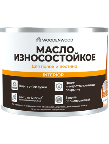 Деревозащитное средство на основе натуральных масел и смол, не образует на поверхности пленку. По истечении времени покрытие не шелушится, не трескается, обновление не требует повторного процесса шлифования древесины. Состав придает обработанной поверхности устойчивость к ежедневному механическому воздействию. Обладает грязе- и водоотталкивающими свойствами. В качестве подготовки поверхности рекомендуем применять Антисептик для интерьерных работ WOODENWOOD. Безопасно для людей и животных.